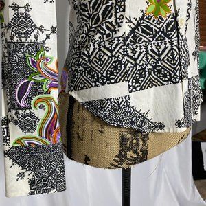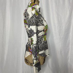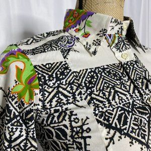 ETRO button up blouse. White with black and multi color design all over. Mandala / paisley like patterns. Button closures down front. Collar neckline. Long sleeves. Light stretch. Size tag not available. Estimated to fit a XS; see measurements. Approx measurements while flat- pit to pit: 15.5", length: 24", waist: 14", pit to cuff: 19", shoulder to shoulder: 14.5"