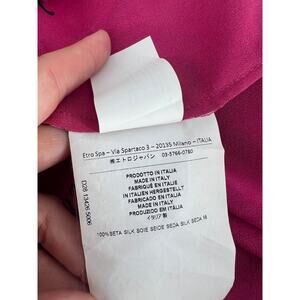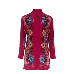 Crafted from luxurious 100% silk, this stunning ETRO longline shirt embodies the Italian label’s mastery of vibrant prints and impeccable tailoring. Set against a rich magenta base, the shirt features a striking botanical and floral design in vivid shades of blue, yellow, green, coral, and black, accented with bold graphic elements for a distinctive statement look. Designed with a sharp pointed collar, full button front, long sleeves with double-button cuffs, and a relaxed, elongated hemline that allows for versatile styling as either a tunic or shirt dress.