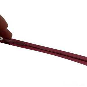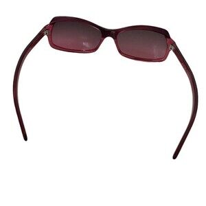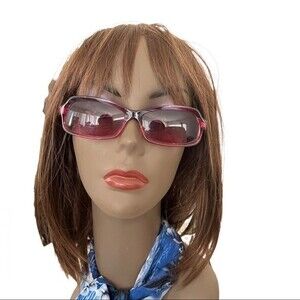 Sort of a pinkish purple frame and tint. Frame is rectangular. Gently worn. I don’t see any scratches.