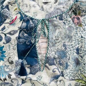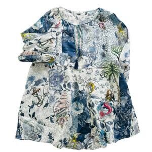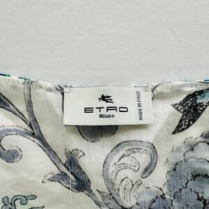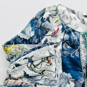 ETRO Tunic Blouse Blue Nautical Floral Motif Size 46 Large Tie Front 100% Ramie