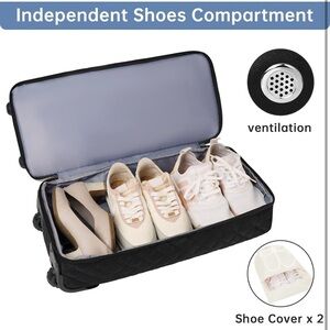 • Shoe Compartment: Fits 3-4 pairs with air vents; includes 2 shoe bags.
