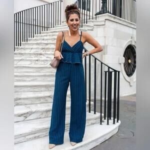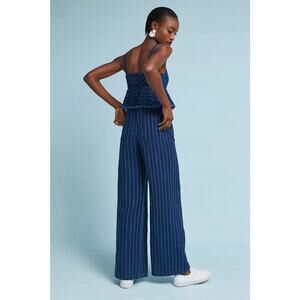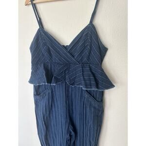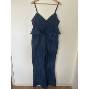 ETT TWA Anthropologie Denim Jumpsuit Size L Blue Stripe Peplum Pockets Wide Leg