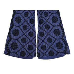 Step into vintage-inspired sophistication with these Anthropologie Ett Twa embroidered eyelet pants, featuring a rich navy jacquard base adorned with bold geometric floral stitching. These high-rise, wide-leg trousers capture Ett Twa's signature blend of artful detail and effortless elegance. The soft structure and flattering silhouette create a graceful drape that elongates the legs while offering comfort and versatility. Perfect for pairing with fitted tops, cozy knits, or crisp blouses, these pants transition seamlessly from casual afternoons to elevated evenings.