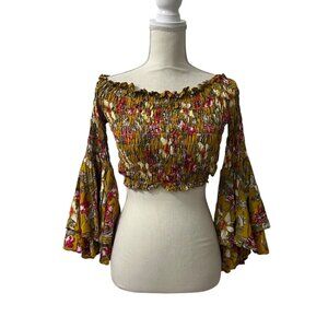 ETwo Floral Smocked Off Shoulder Bell Sleeve Fairy Cottage Boho Crop Top S