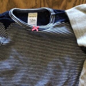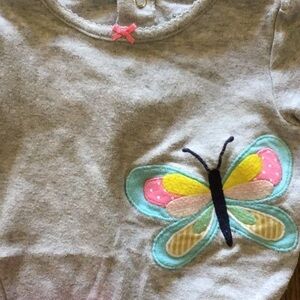EUC 3 piece matching set includes one gray onesie with an embroidered butterfly, a striped onesie, and pink polka dot leggings. No damage, stains, or odor. Smoke free home.