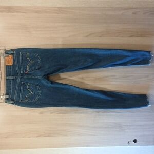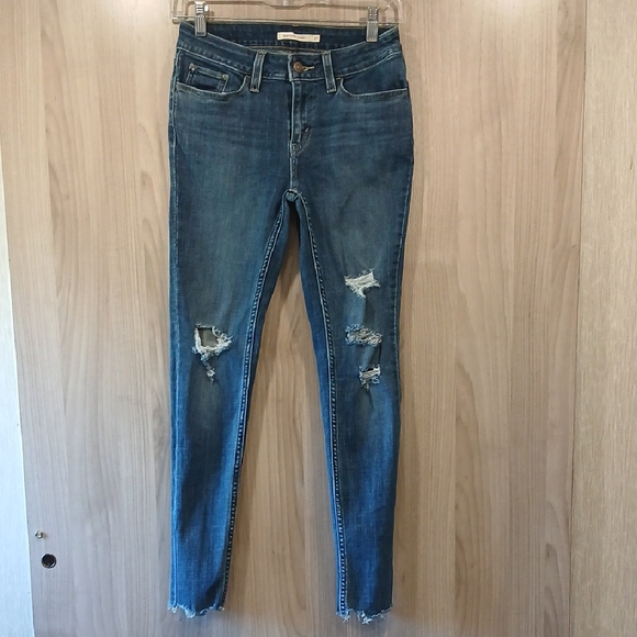 EUC Levi's blue skinny jeans feature a stylish distressed look with rips around the knees and subtle fading along the thighs, offering a trendy and worn-in appearance. Functional back and front pockets, and zipper fly. Raw hem as well.