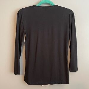 Features a faux wrap front and modal blend knit back for a fitted look that pairs perfectly with denim, leather, or leggings.