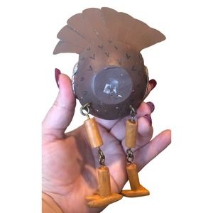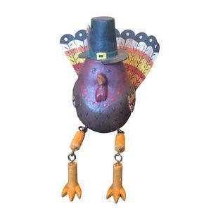 Adorable vintage turkey figurine with hanging legs and a metal tail feather. Awesome 90's throwback.