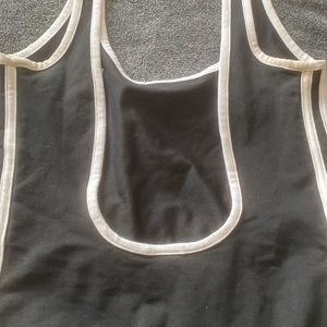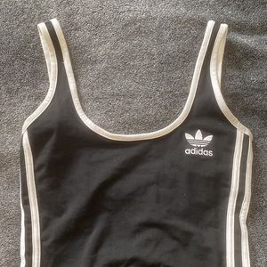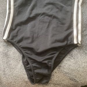 Black and white stripped adidas body suit. The back has a low dip. No size tag but runs as a S/M. Authentic.