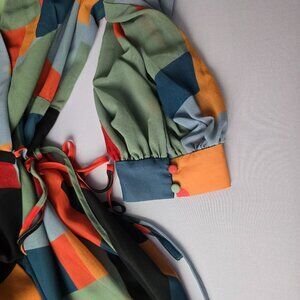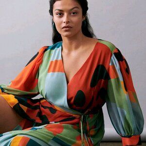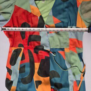 Wrap dress so measurements have some leway smaller or slightly bigger. Worn once for a wedding. One small area on front right that the coloring looks off, pictured.