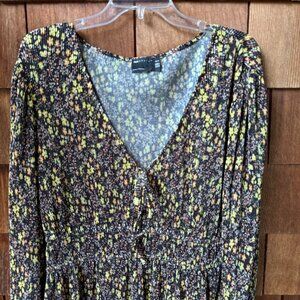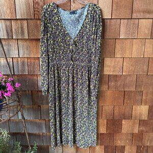 In Excellent, Lightly Worn Condition! Black and Gold Ditsy Floral Print ASOS Curve V-Neck Long Sleeve Midi Dress in Women's 16 - Perfect Fall dress resists wrinkles, travels well, easily goes from day to evening.