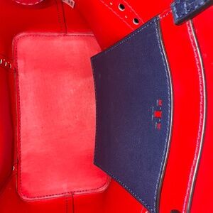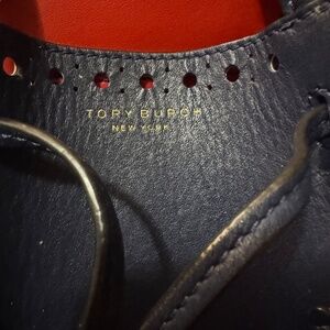 This is an excellent used condition authentic Tory Burch, bucket Crossbody bag in navy blue with red interior and laser cut design