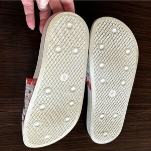 Flower patter with purple, green, orange and pink floral pattern on a white sandal.