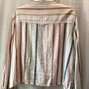 Excellent used condition🌸 super soft, boxy and striped with gorgeous warm tones /autumn colors of brick, brown, indigo, terracott, etc. Linen and Cotton blend but it doesn’t wrinkle easily. I washed in cold water and dried on low for a short cycle, per tag directions. Measures 20” pit to pit and 20.5 shoulder to hem. Size small but not fitted. Sleeve have tabs in case you want to roll up as shown in last picture. Thanks for looking!