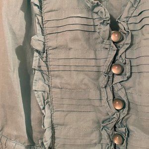This top is lighter than air! Beautiful aqua colored blouse. Tuxedo ruffle detailing at yoke, with mother of pearl buttons on placket. Cap sleeves. Self-tie around back cinches waist. And it has pockets!!! It shows no signs of wear, and no odors, defects, or stains. Lovingly cared for in smoke and pet free home. I'm selling because I never wear it, and it is a bit small for me right now. For reference, I am 5'1" and 38 bust, 29 waist, 40 hips. Feel free to make an offer!