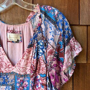 In Excellent, Lightly Worn Condition! Anthropologie Robin Tiered Patchwork A-Line Short Sleeve Dress in Women's Medium - Perfectly Patchwork Bohemian Style Dress with a V-Neckline, Short Sleeves, and tiered A-Line Silhouette.