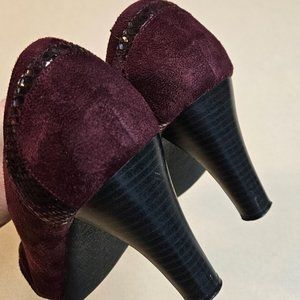 Barely worn and in amazing condition for a vintage brand. Burgundy suede fabric with manmade snake trim. Peep toes stacked heel. Review photos for condition. Bundle for additional savings and combined shipping.