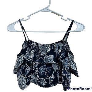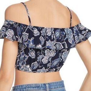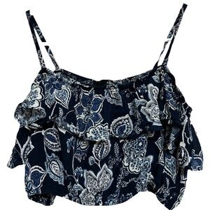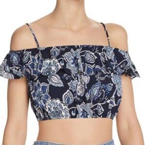EUC Aqua off the shoulder, navy blue floral ruffled crop top