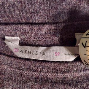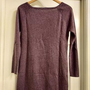 Excellent gently worn Athleta purple 100 percent merino wool sweater dress. Long sleeves with rib detail. Size small petite. Measurements shown. There looks to be a small light spot in the front right hand side of the dress. Not very noticeable unless you look close up.