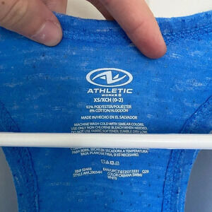 Women’s Athletic Works tank top. Top is bright blue with a textured material. Knotted in the middle, but knot can be undone. Size XS. Smoke free home!