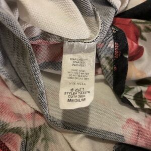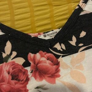 EUC BEAUTIFUL Tank Top, by BOMBOM. Size M. Top has thin straps and a rounded bottom. Top is covered in thick black and cream stripes and a beautiful rose floral pattern.