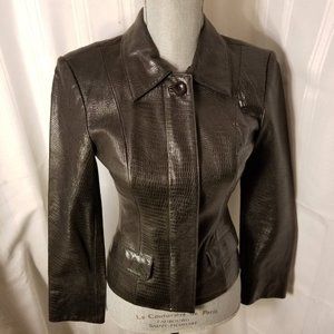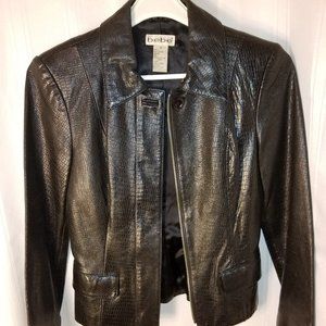 Excellent Pre-Owned Leather BEBE Jacket. It has a a really nice pressed crocodile finish. It measures 15 1/2" across the chest laying flat (thus 31") but it has darting in the front as well as it is made to compensate for the bust. Nice tapered waist. Two front flap pockets. The sleeves are 23" from the top shoulder seam. It has a full front zipper fully hidden with a nice top button at the collar. 16" from shoulder seam to seam