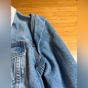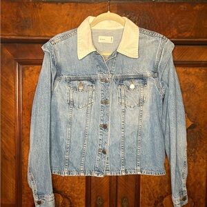 Trendy blue denim jacket with a classic design. Features a white collar for a chic contrast.