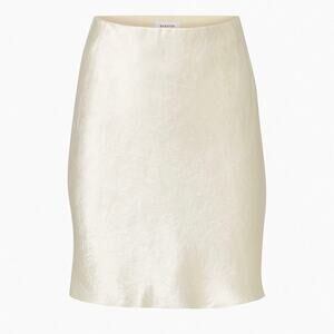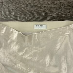 Babaton slip satin mini skirt in a light champagne tone. Features a smooth pull on waistband, fluid satin finish, and an A line silhouette that moves easily. Fully lined for a comfortable, flattering fit. Worn once and in excellent condition with minor wear, no major flaws as pictured.