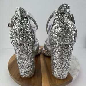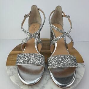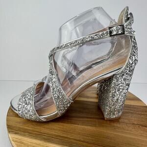 EUC Badgley Mischka Womens Cook Metallic Glitter Cross Strap Silver Block Heel 9