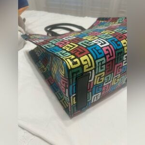 Stylish Balmain tote with a colorful geometric design. Perfect for a bold fashion statement. Features sturdy handles and spacious interior.