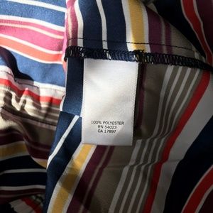Classic design; elastic at back waist; butterfly sleeves; cute variable stripes in navy, bright coral, mustard, dark taupe, burgundy, and cream