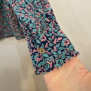 Anthro brand Banjanan popover top featuring ruffle trim, back keyhole and button closure, full-length sleeves with button cuffs, pintuck front detailing, and a lightweight 100% cotton fabrication in a pretty teal green, pink and navy blue floral print.