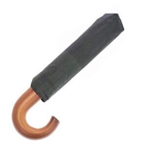 Classic and timeless Barbour tartan compact umbrella in green, blue, and black plaid. Crafted from durable technical polyester fabric with a sturdy metal frame and elegant wooden curved handle. Folds easily for travel while maintaining that signature Barbour British countryside charm.