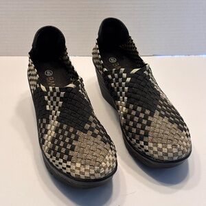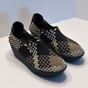 EUC Bernie Mev Women's Woven Black Gold Wedge Heel Shoe SZ 40 = 9.5 / 10 Slip On