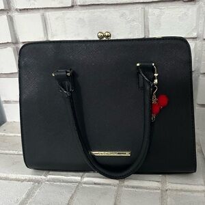 EUC-Classic black satchel that has a kisslock closure, beautiful floral interior, and two small bows at the bottom of handles by Betsey Johnson. Includes a crossbody strap. Interior has a zipper compartment and two slip pockets. Measures approximately 12”L x 10”H. Includes custom Betsey Johnson upcycled key chain key fob. Absolutely pristine condition.