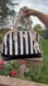 Stylish satchel with bold black and white stripes. Features pink handles and trim. Adorned with a heart and flower charm.