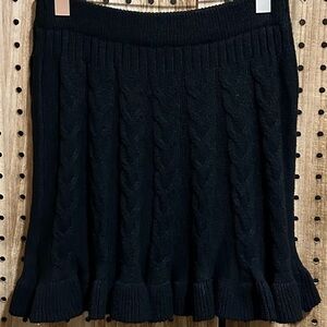 Stylish black cable knit skirt. Features a ribbed waistband and ruffled hem. Perfect for any occasion. excellent condition