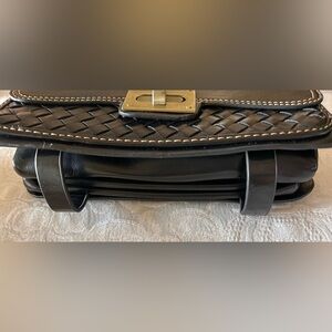 This elegant black quilted bag features a stylish chain strap and a secure clasp closure. Perfect for any occasion, it adds a touch of sophistication to your outfit. 7 in chain drop. 3 card slots. Optional cross body strap with max 24” drop. Very soft material with one flaw on the zipper as pictured.