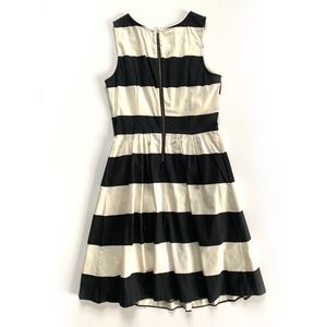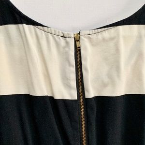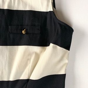 Super cute, sleeveless cocktail dress from The Limited. Black and cream wide stripes with a gold zip back and cute gold round button on left chest. Not to mention, there are pockets! Hem line hits just above the knee, depending on how tall you are. Dry Clean only.
