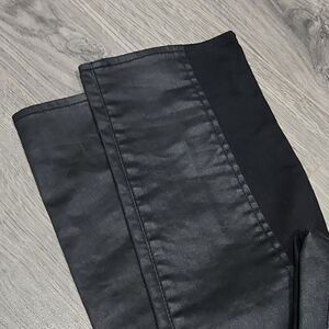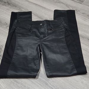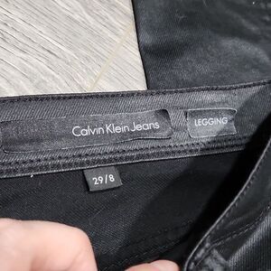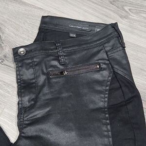 EUC Black Calvin Klein Lean Fit Jeans are absolutely flawless and have a slight sheen with cotton inser on the sides of the legs. Front and rear zipper pockets. The waist flat is 15", 9", and the inseam is 32".