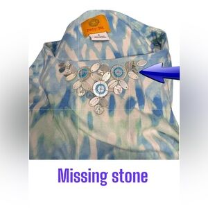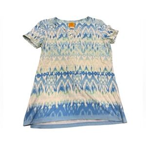 EUC Blue & White tie dye Ruby Rd Embellished neckline tee tropical resort boho S