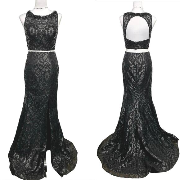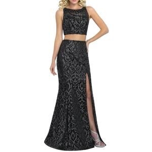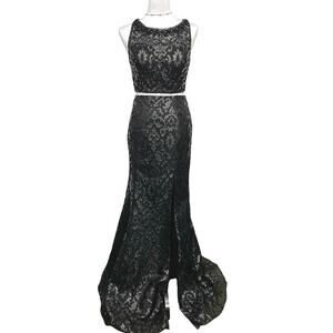 Two piece, mermaid, embellished crop top gown. This stunning gown features a sleeveless crop top with intricate embellishments and a high neckline, paired with a long, fitted mermaid-style skirt, high slit on the left side, that flares at the hem. The back of the crop top showcases a unique cut-out design, adding a touch of modern elegance. Fully lined, hidden zipper in skirt. Hook/eye closures on the crop top. Perfect for proms, galas, or any event that you want to turn heads!