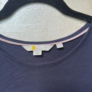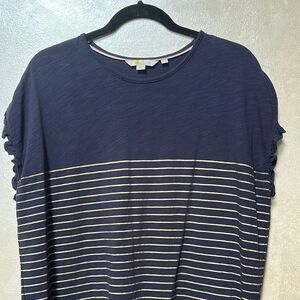 Chic navy dress with gold stripes - ruffle on sleeves. No shoulder seams . Perfect for versatile styling. Comfortable and elegant.