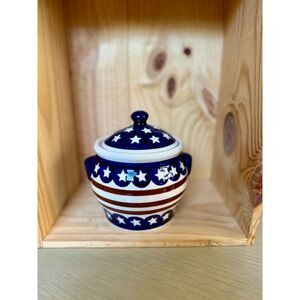 EUC Boleslawiec Stars & Stripes Red White Blue Covered Sugar Bowl Polish Pottery