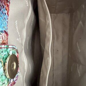 The Beautiful EUC Brahmin RESERVOIR MELBOURNE APRIL Leather Tote is a large, multicolor tote with double handles and a magnetic snap closure. Made from leather with gold hardware, it features inner and outer pockets, a mobile phone pocket, bottom studs, and an adjustable strap. The bag is lined with beige and includes a brand card, key holder, maintenance card, bag charm, and original dust bag. Perfect for travel, casual, workwear, or business occasions, this designer tote from Brahmin's April collection is a stylish and practical addition to any woman's wardrobe.