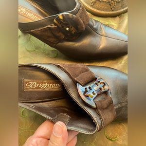 EUC Brighton Brown Leather Rococo Mules, Sz. 8.5M. Suede trim with Brown Tortoise buckle. Heels 3”. Made in Italy. Shows some wear on toes as indicated in last photo.