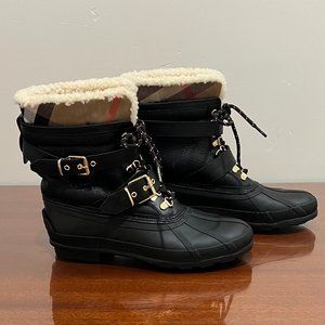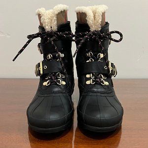 Practically new condition! Only worn twice and not ever outside. Super comfortable and very warm! Shearling lining and a rounded toe with a textured rubber sole. Lace up front with adjustable buckled straps.