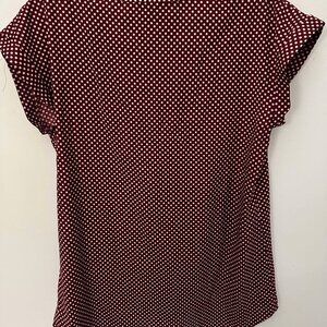 EUC Burgundy/White polka dot V-neck blouse with cuffed cap sleeves, size Small