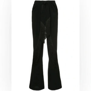 Very high quality! Presenting a wonderful pair of black pants with front tie straps (with fringe ends) and fringe down half the legs.