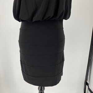 Gorgeous beaded neckline little black dress. The photos do not do this justice! Drapey front panels and fitted bottom. Drapey back with slight cut out and strap across back. Side zipper with hook and eye enclosure, stretch in material. Perfect for all your special occasions! Size small. 95% polyester 5% spandex. Retails $135